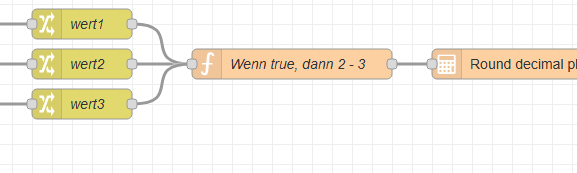 Wie im Beispiel zu sehen, hat der Funktions-Node nur einen Eingang, über den alle drei Werte übergeben werden. Wichtig: Ein Wert liegt niemals dauerhaft auf einer Node-Verbindung an. Es handelt sich lediglich um eine Nachricht, die verarbeitet und dann weitergereicht wird.