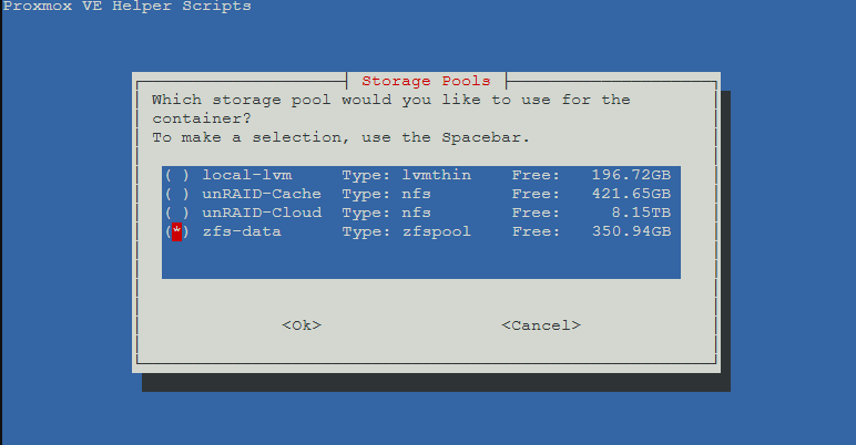 In meinem Fall hier gehe ich mit Pfeiltasten zu zfs-data, welches ich anschließend mit der Leertaste auswähle, da es sich hierbei um ein mehrere Hosts umfassenden Speicherort handelt, wo der Container später frei zwischen den Hosts verschiebbar wird. Habt ihr sowas nicht, oder möchtet ihr den Container später nur auf dem einen Proxmox-Host nutzen, könnt ihr auch einfach local-lvm auswählen. Mit der Eingabetaste fahrt ihr hier fort.