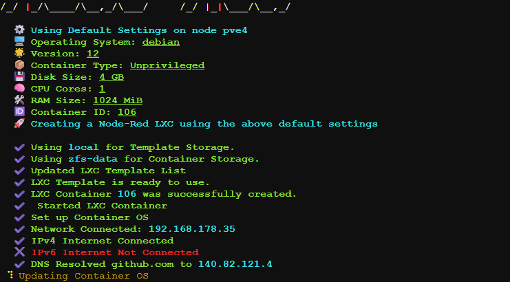 Die Installation von Node-RED unter Proxmox-VE als Linux Container ist dank den Proxmox Helper Scripts denkbar einfach. Hier ist nämlich ein Script zur vollautomatischen Erstellung eines Containers samt anschließender Installation von Node-RED verfügbar.1