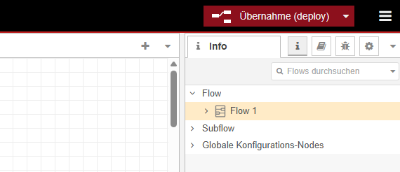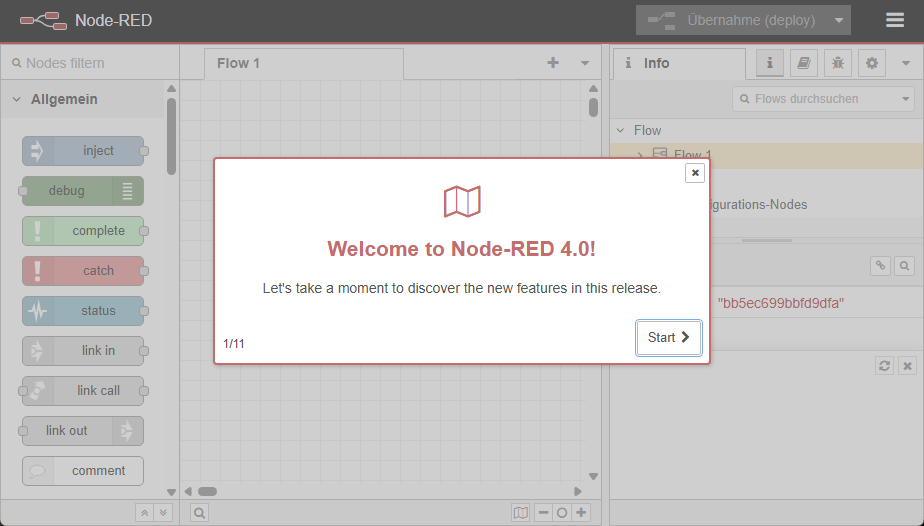 Nun solltet ihr euch mit den Funktionen und Möglichkeiten von Node-RED vertraut machen. Spielt ruhig etwas herum, probiert Nodes aus, usw. Dank der grafischen Nutzeroberfläche und den logischen Zusammenhängen ergibt sich vieles von selbst.