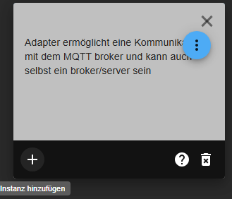 Eine weitere Instanz fügen wir hinzu, indem wir im linken Menü, wie auch bei der Installation, in den Adapter-Katalog gehen, dort wieder MQTT suchen und bei dem bereits installierten Adapter Instanz hinzufügen wählen.