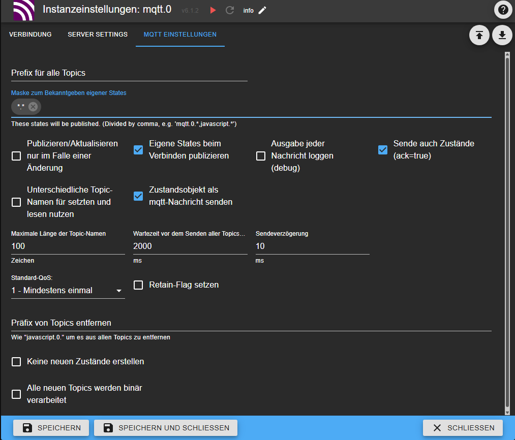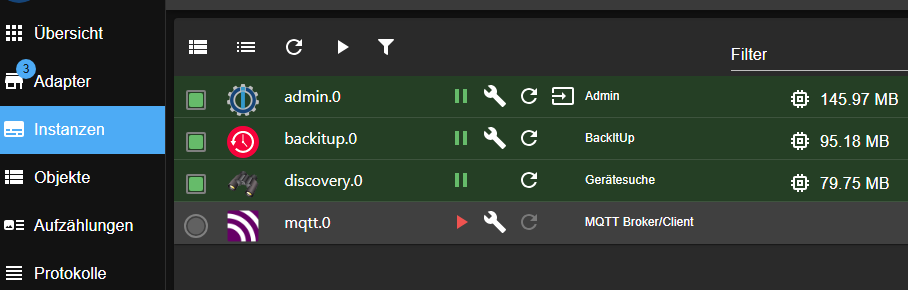 Anschließend wählt ihr Speichern und Schließen und startet die Instanz durch klicken auf den Play-Button in der MQTT-Zeile.