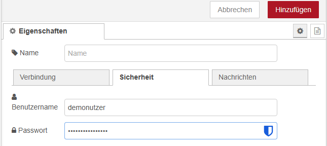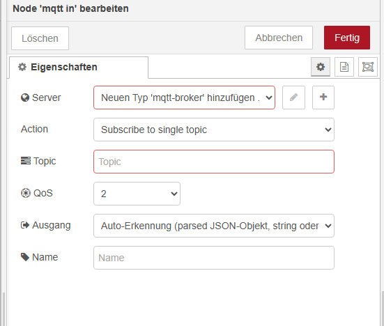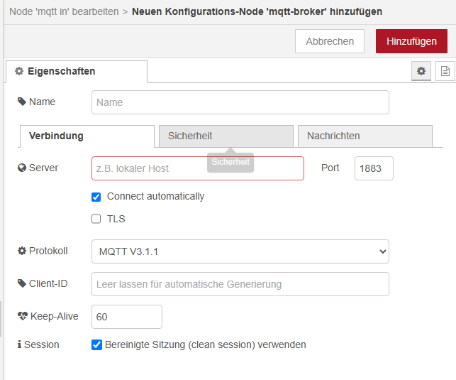 Nun sieht der Eigenschaften-Dialog des mqtt in Nodes so aus, und es existiert der Server