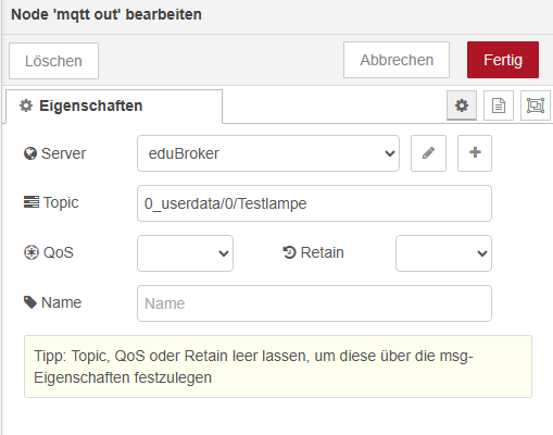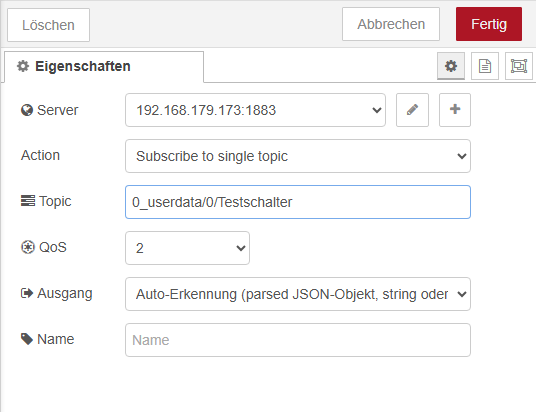 Hier wähle ich nun wieder unseren bereits erstellten Server und als Topic dieses Mal den ebenso vorhin manuell erzeugten Schaltzustand Testlampe.