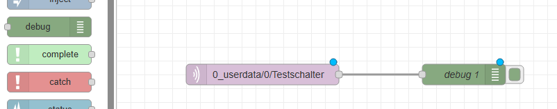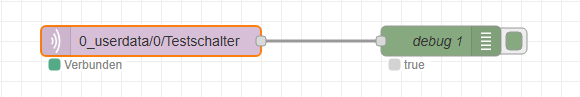 Zurück in Node-RED ziehen wir uns in unseren Flow zum Testen nun auch wieder den debug-Node rein und verbinden beide mit einer Linie.