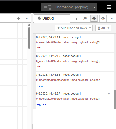 Ändern wir nun den Zustand vom Objekt in ioBroker, wird der neue Zustand über den MQTT-in-Node an den debug-Node übermittelt und im Debug-Bereich in Node-RED ausgegeben.